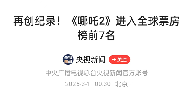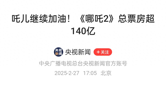 就在昨天《哪吒2》票房前脚破了140亿,后脚才五分钟时间,央视新闻就发文称,“吒儿无间加油!”