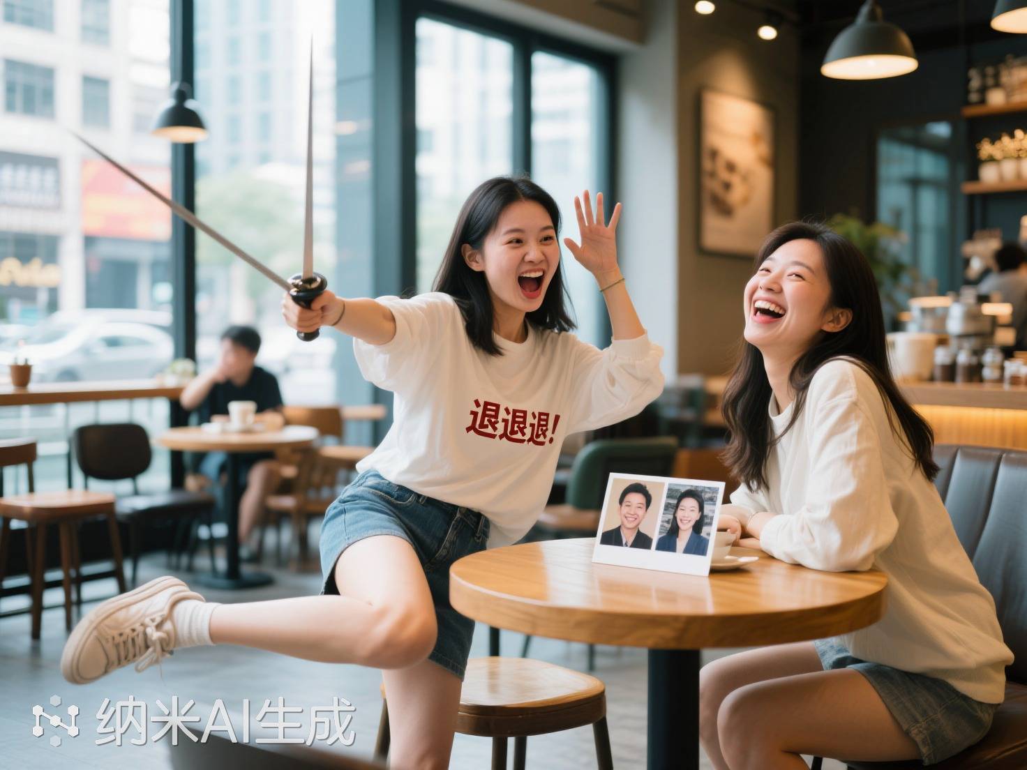 我和林晓冉蹲在咖啡馆边缘狂笑时,邻桌大叔的咖啡杯齐在颤。她刚用一套游刃过剩的“退退退”组合技,把我妈安排的相亲对象吓得差点钻桌底——右手食指中指并拢戳向对方胸口,左腿相助着小碎步顿脚,嘴里还自带电音混响:“退!退!退!”活像老版《西纪行》里作法的羽士。