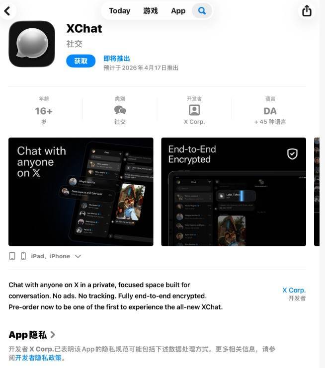 智东西4月13日报谈,4月11日,马斯克旗下的酬酢软件XChat官宣将于4月17日厚爱上架,这个被称为马斯克“国际版微信”的软件,终于要和用户碰头了。当前仅不错在App Store下载,且需要iOS 26版块,安卓和Mac尚未适配。
