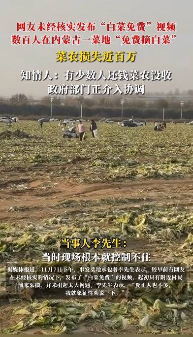 据三湘齐市报,11月7日下昼,事发菜地承包者李先生暗示,较早前有网友在未经核实的情况下,发布了“白菜免费”的视频,起初只消隔壁村民前来采摘,并未引起太大问题,“归正东说念主也未几,我就符号性劝说一下。”李先生说。